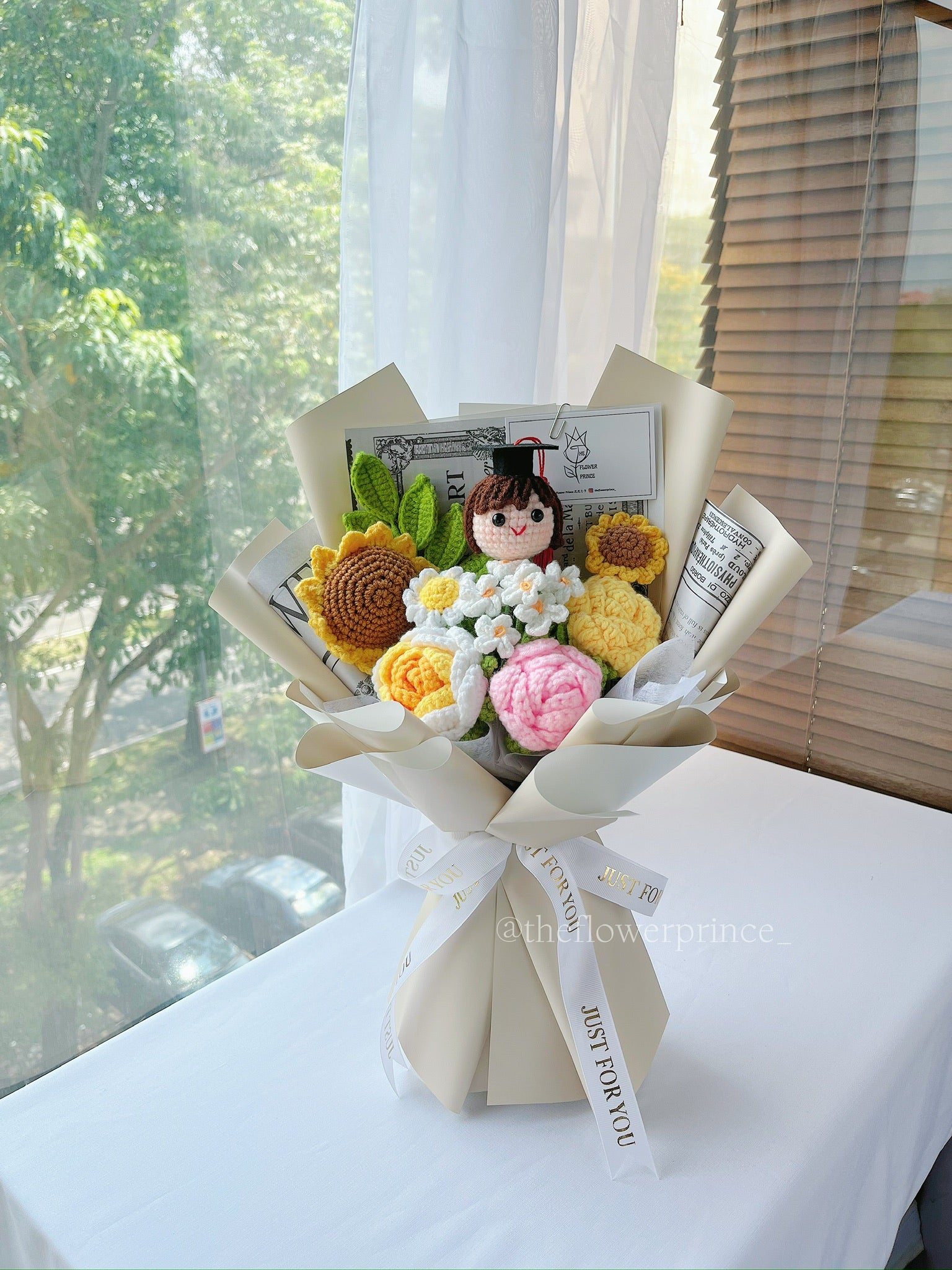 Sunflowers, Graduation Doll, Roses, Daisies,Β Eucalyptus and Myosotis with Khaki Packaging.
