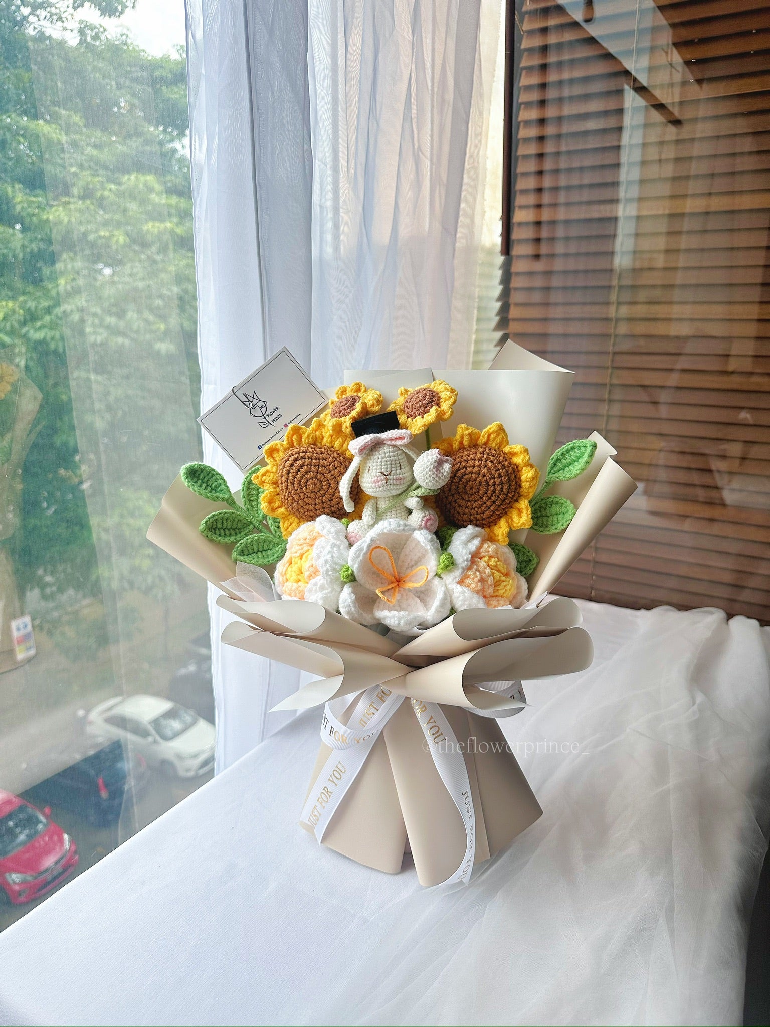 Sunflowers, Crochet Bunny Doll withΒ Graduation Hat, Tulips, Roses, Eucalyptus and Daisies with Khaki Packaging.Β