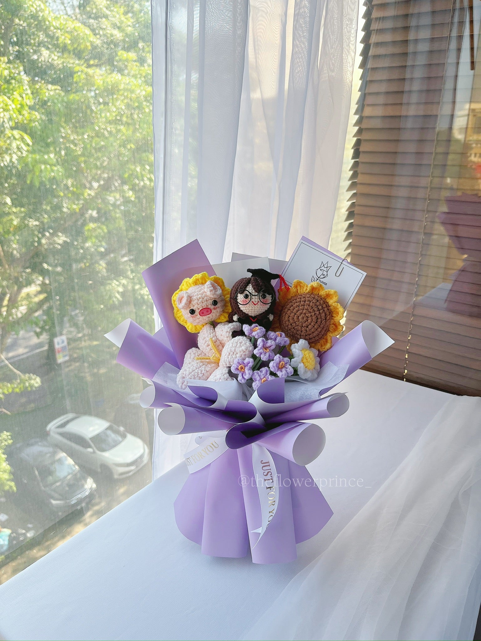 Sunflower, Graduation Full Body Doll, Flower Piggy Head, Daisy, Tulips and Myosotis with Purple Packaging.Β