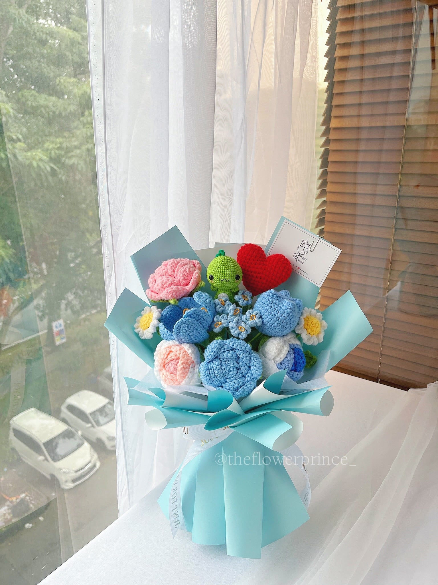 Crochet Dinosaur Doll, Red Heart, Roses, Tulips, Daisies, Myosotis with Sky Blue Packaging.Β